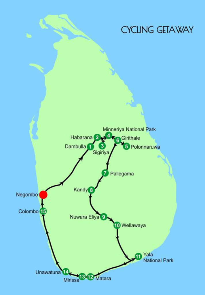 Explore the coast of Negombo and witness colourful fishing boats, friendly people and beautiful landscapes. Leave to Dankotuwa, where you can embark on a morning cycle ride through small back roads and the stunning forest to the border of Kuliyapitiya. Ride alongside lakes and canals towards Sigiriya and enjoy a climb of the majestic rock fortress. Returning to the cycle ride, you can explore Polonnaruwa and follow through landscapes dotted with forests and villages, with around 30km on inner roads.